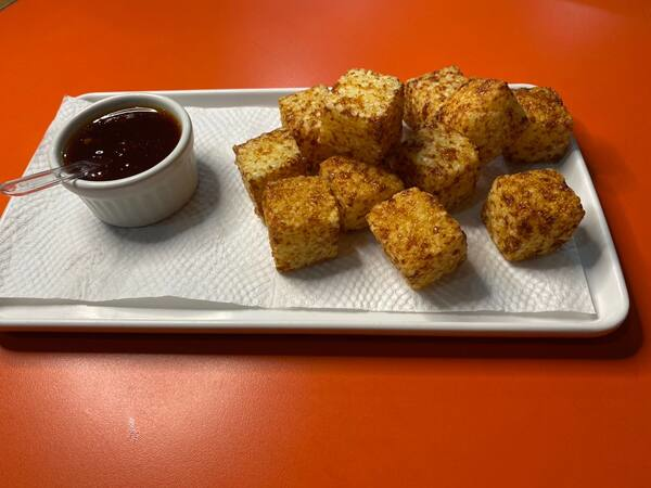 Deliciosa porção de quadradinho de tapioca com queijo acompanhado da nossa famosa geleia de pimenta artesanal.